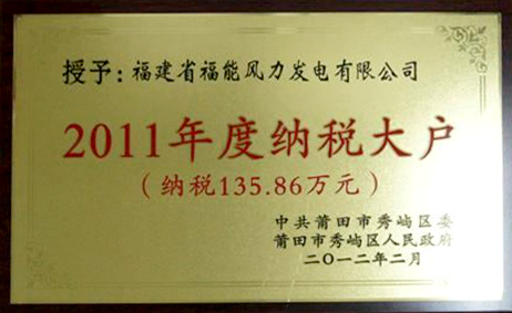 2012年2月,秀屿区委区政府授予福能风电公司2011年度纳税大户称号